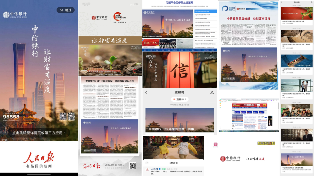 在傳播策略方面,以“擴大品牌影響力”為目標,精準傳達品牌主張,中信銀行制定了“一體兩翼多點支撐”的傳播策略,辦公室統一節奏,統一物料,統一話術,分預熱、發布、延續三步走,借助央視總臺權威背書作用,通過《人民日報》等核心黨央媒體,《中國證券報》等19家頭部媒體,《正和島》等22家自媒體,聯合總行部門、子公司媒介矩陣,組織37家分行好整合傳播戰役,奏響品牌煥新升級的合聲,進一步激發廣大員工責任感、使命感、榮譽感,向社會各界展示了中信銀行全新品牌形象。截至2022年末,本次品牌煥新升級發布整體曝光量高達11億+人次,觀看閱讀量3億+人次,引發社會各界廣泛關注。
